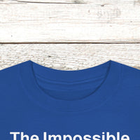 Bella+Canvas baby t-shirt with “Impossible Baby” design and faith-filled message, soft cotton, breathable and durable, Christian apparel for infants and family matching, baby girl in white shirt