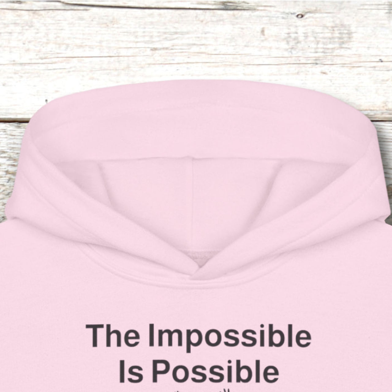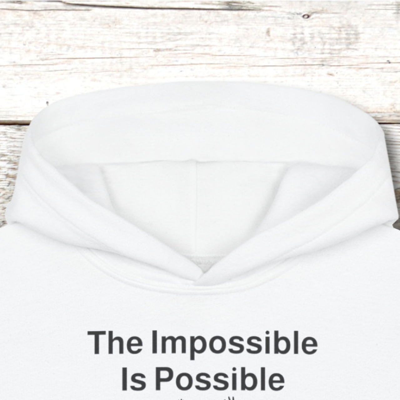 Gildan youth unisex hoodie with “Impossible Girl” design featuring a girl walking on water and uplifting message, Christian apparel made from soft preshrunk fleece, ideal for cooler weather and faith-forward style, girl in white hoodie